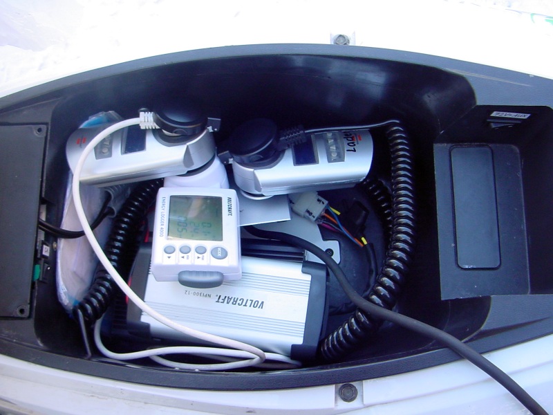 Dem Wandler habe mit vier M6-Schraubenköpfen Füße verpasst, so dass der Luft zwischen seiner Unterseite und dem Helmfach kriegt. Fast 3Kg sind so zusätzlich im Roller unterwegs, zumindest im Winter.