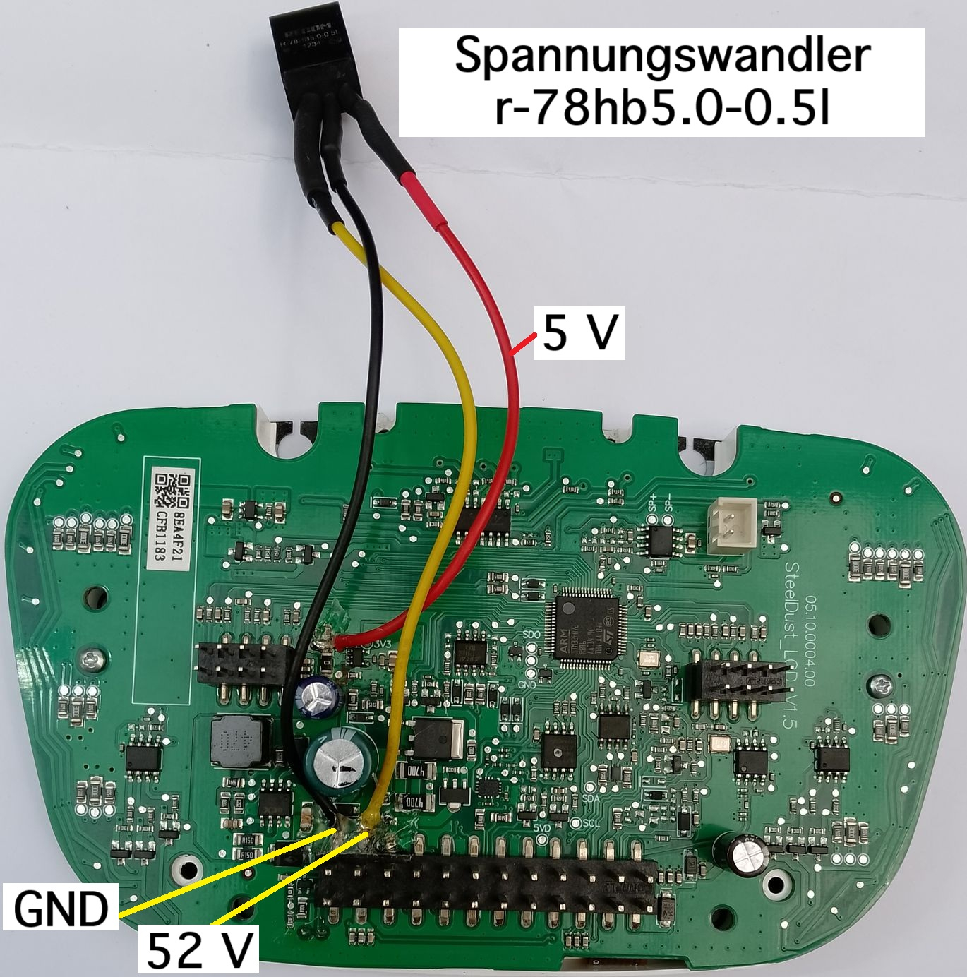 Das heist der Spannungswandler von Batterie 52V auf 5 Volt ist defekt.