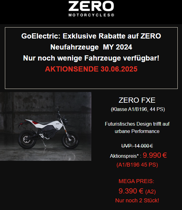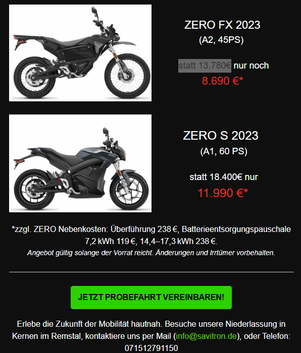 Der neue Zero Händler Savitron in Kernen im Remstal hat heute eine Email geschickt, da er noch eine Menge stark reduzierte Zeros aus 2024 und 2023 feilbietet: