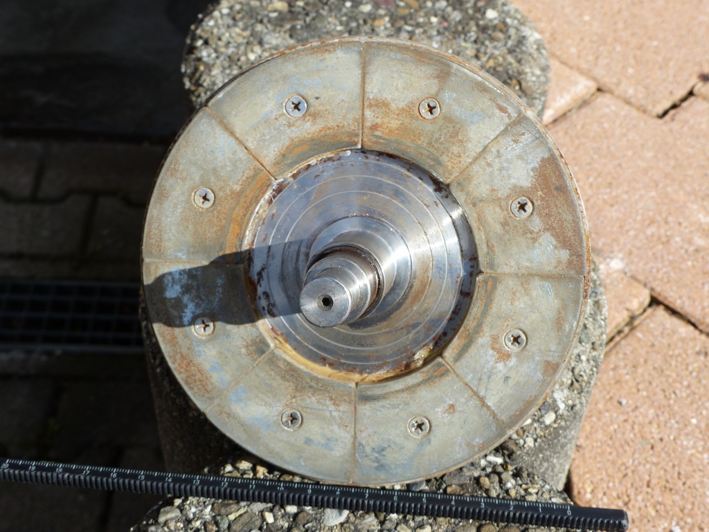 Den Motorkern mit Stator und Rotor konnte ich dann aus dem Abtriebswellenlager in der Alu-Gehäuseglocke herausziehen, das den Blick auf den korrodierten Rotor samt Abtriebswelle freigibt:Gut zu sehen sind die 8 Schraubenlöcher, mit denen die 8 Kuchenstück-Magnete am Rotor zusätzlich zu einer Verklebung gesichert sind. Mein Rotor hat also tatsächlich verschraubte Magnete, das ist gut.