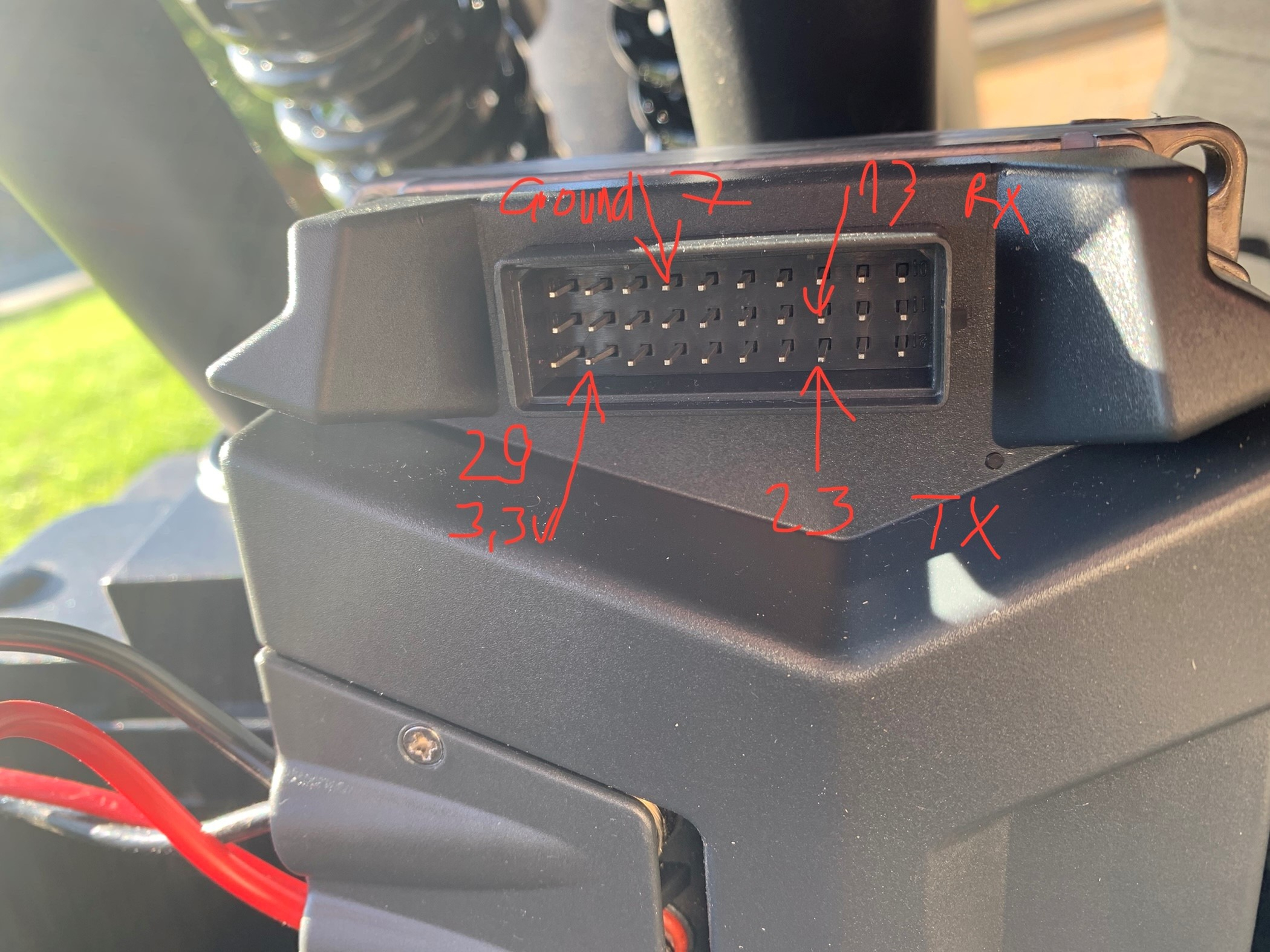 Die Pins 13 und 23 mit USB zu RS485 (A an Tx B an RX) verbinden. Siehe Bilder