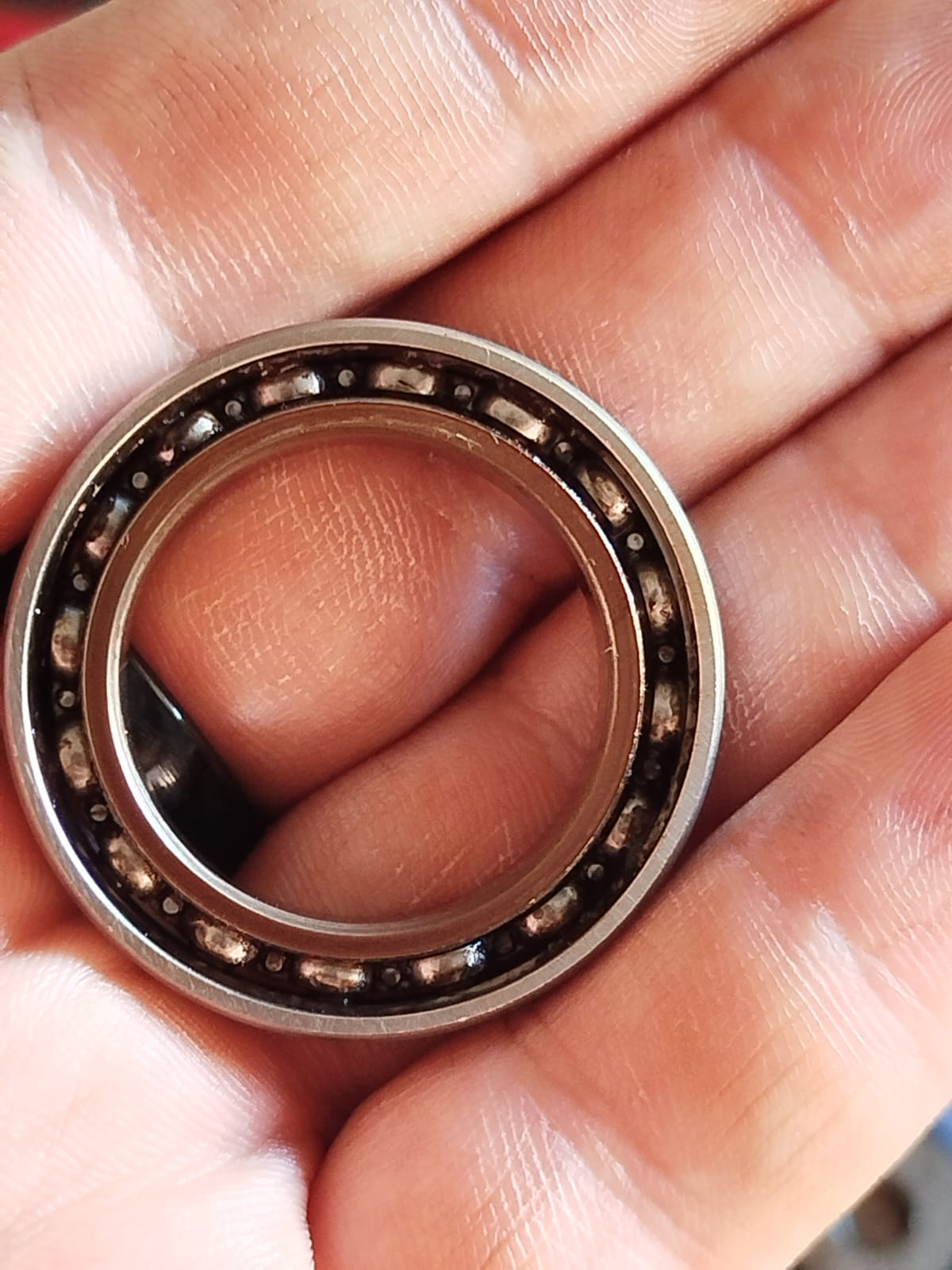 Ein Lager der Antriebsseite hackt (ich hatte beide Lager der Antriebsseite erneuert), und ist sogar am Innenring angelaufen. Das bedeutet es hat sich der Innenring auf der Welle gedreht und nicht das Lager selbst. Man kann auch Schleifspuren am Außenring erkennen. Also ist der Lagersitz im Gehäuse auch defekt.