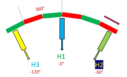 Hier Liegen die auf Nr. H1 folgenden Hall-Schalter je -60° zurück in der Phasenschwingung (Rot: Nordpol-Magnet, Grün: Südpolmagnet).