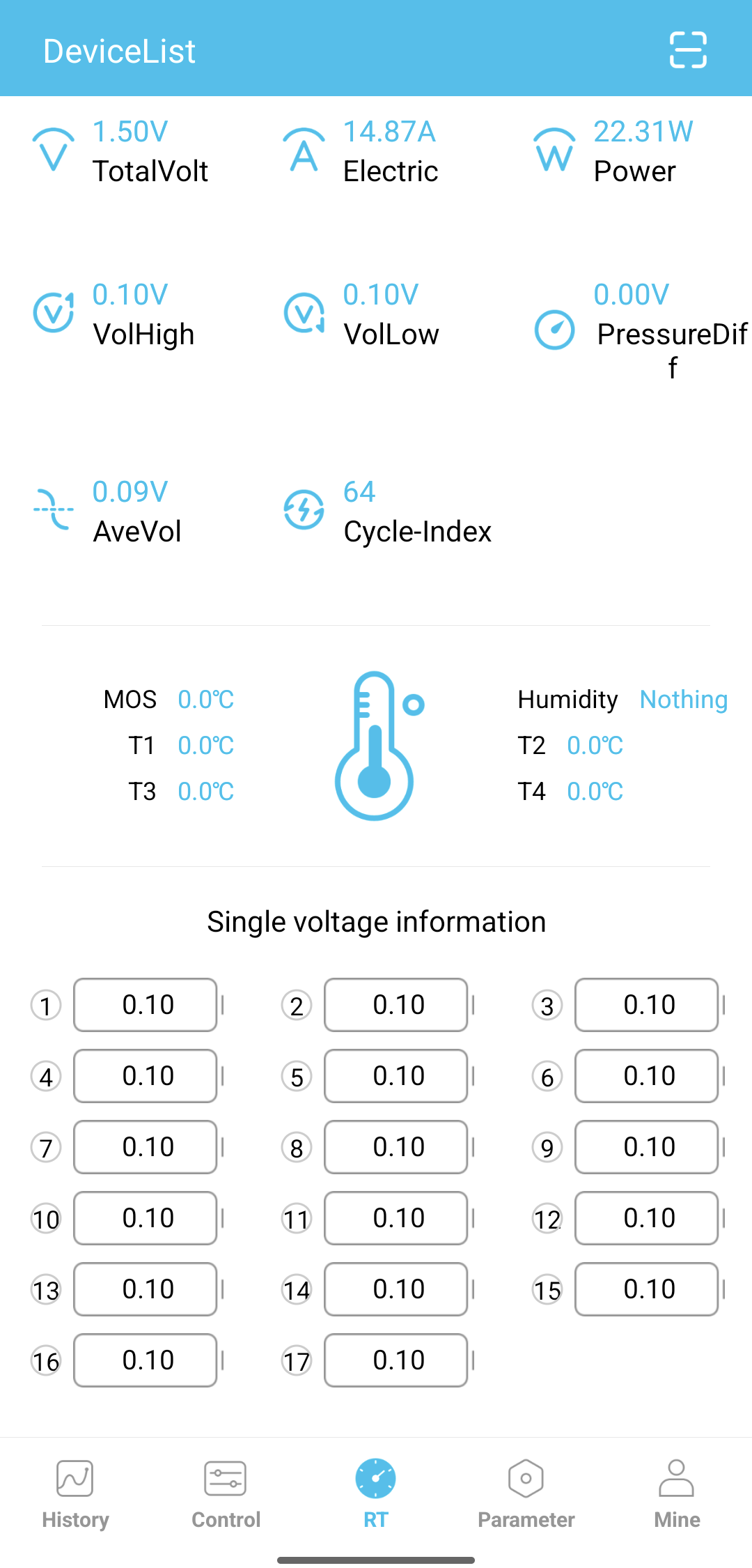 Mit einem Labornetzteil konnte ich eine Bluetooth-Verbindung herstellen und habe die folgenden Werte erhalten ( immerhin stimmt das Balancing 🫣):