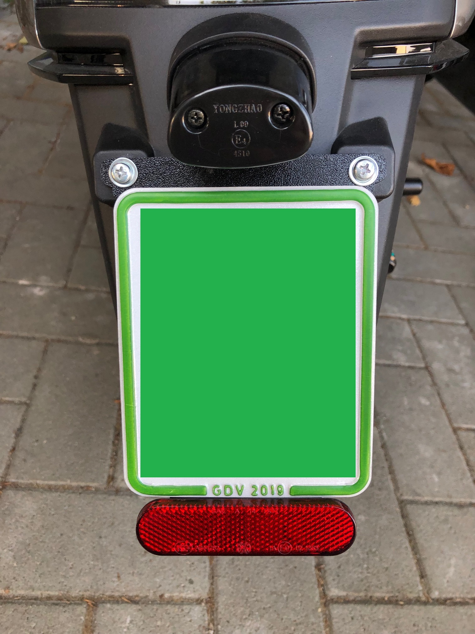Ich habe auf die Schnelle einen rahmenlosen Kennzeichenhalter mit passender Anbringung für den originalen Reflektor erstellt, kein Meisterwerk, aber funktionell und nutzbar.