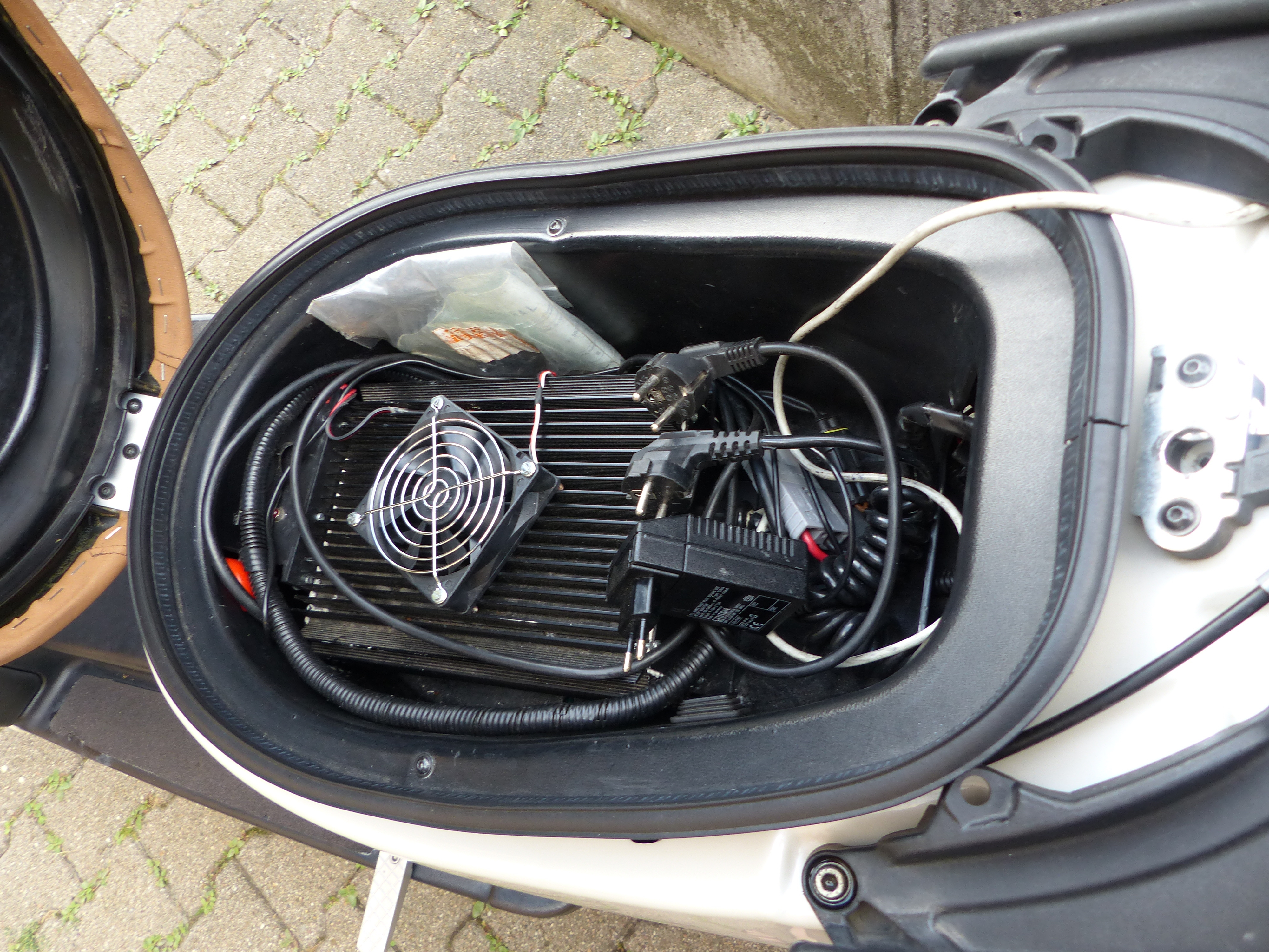 Schwer zu sagen, wie und ob sich da eine Reparatur lohnt. Das Ding dürfte sich selbst zu Tode kochen beim laden. Ich hatte einen geregelten PC Lüfter draufgeschraubt, was ihn selten hat über 40°C kommen lassen: Ich vermute mal, ohne Bilder davon gesehen zu haben, dass der Kaltegerätestecker durchgeschmort ist? Der Lader war bei Dir immer noch überm Motor eingebaut, auf die Blechplatte unterm Helmfach?