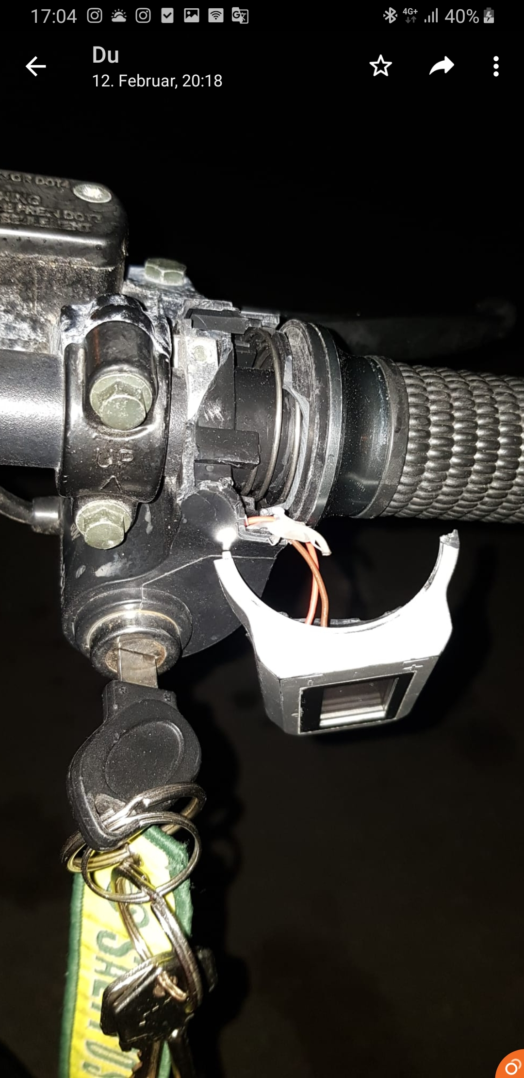 Also ich bin zwar technisch ken DAU, aber so ein extremer Bastler bin ich dann auch wieder nicht. ^^ Da kommt ja was von unten nach oben. Also einfach nur Gas und An/Aus ist das nicht, das geht ja auf nen Display rauf, wo 3 Kabel drauf gehen. Das Display kann ggf. nen ding weg haben, weil eines der Kabel lose war und auf nem Kontakt gekommen ist und es nen funken gegeben hat. Der Roller selber lässt sich aber noch einschalten, licht und Hupe gehen noch. Nur kann ich halt kein Gas mehr geben und das Display ist auch tot. Also ich könnte ggf. das Display erstmal überbrücken....aber so toll ist die Lösung dann doch nicht ^^ Darum wollte ich ja wissen was das für ein Gerät genau ist. Würde es ja gerne wieder im halbwegs Originalzustand haben. ^^