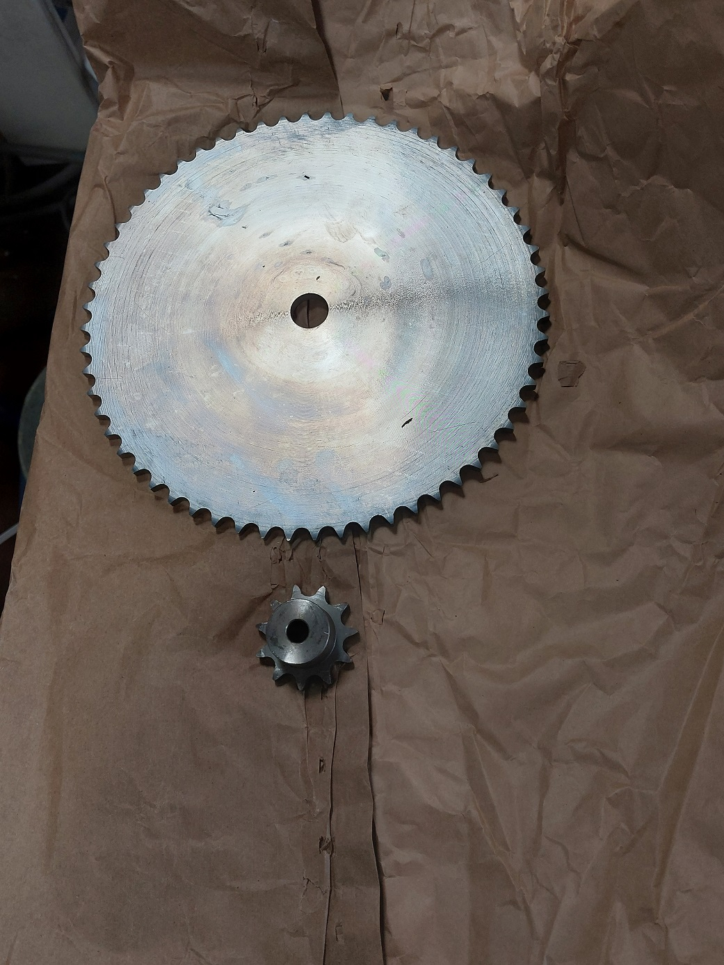 so, ging ein wenig vorwärts. Über Pfingsten mal schnell die Motorhalterung gemacht und mattschwarz Pulverbeschichtet. Diesen Freitag ist dann der neue Kettenrad Satz angekommen. Musste allerdings andere grössen nehmen , als gedacht. Gedacht erst 16 Zähne und 70 Zähne. Ausweichgrösse jetzt 11 und 60. Das 11 er ist etwas klein, da die Welle 25.4, also 1Zoll ist und der Aussendurchmesser vom Zahnrad bei der Aufnahme nur 29mm. Musste da also noch ne Überstülphülse machen, damit das hoffentlich hält. Das grosse war ja kein Problem. Gut , hätte jetzt noch etwas mehr erleichtern können. Aber so ist es sicher stabiel genug. Das elfer musste ich einsatzhärten. Also 880 Grad aufheitzen. Dann glühend in Kohlepulver . Das 3 mal gemacht. Danach erst mit Öl abgeschreckt. Nicht funktioniert, weich geblieben. Also noch mal, aber diesmal mit Wasseröl Emulsion.