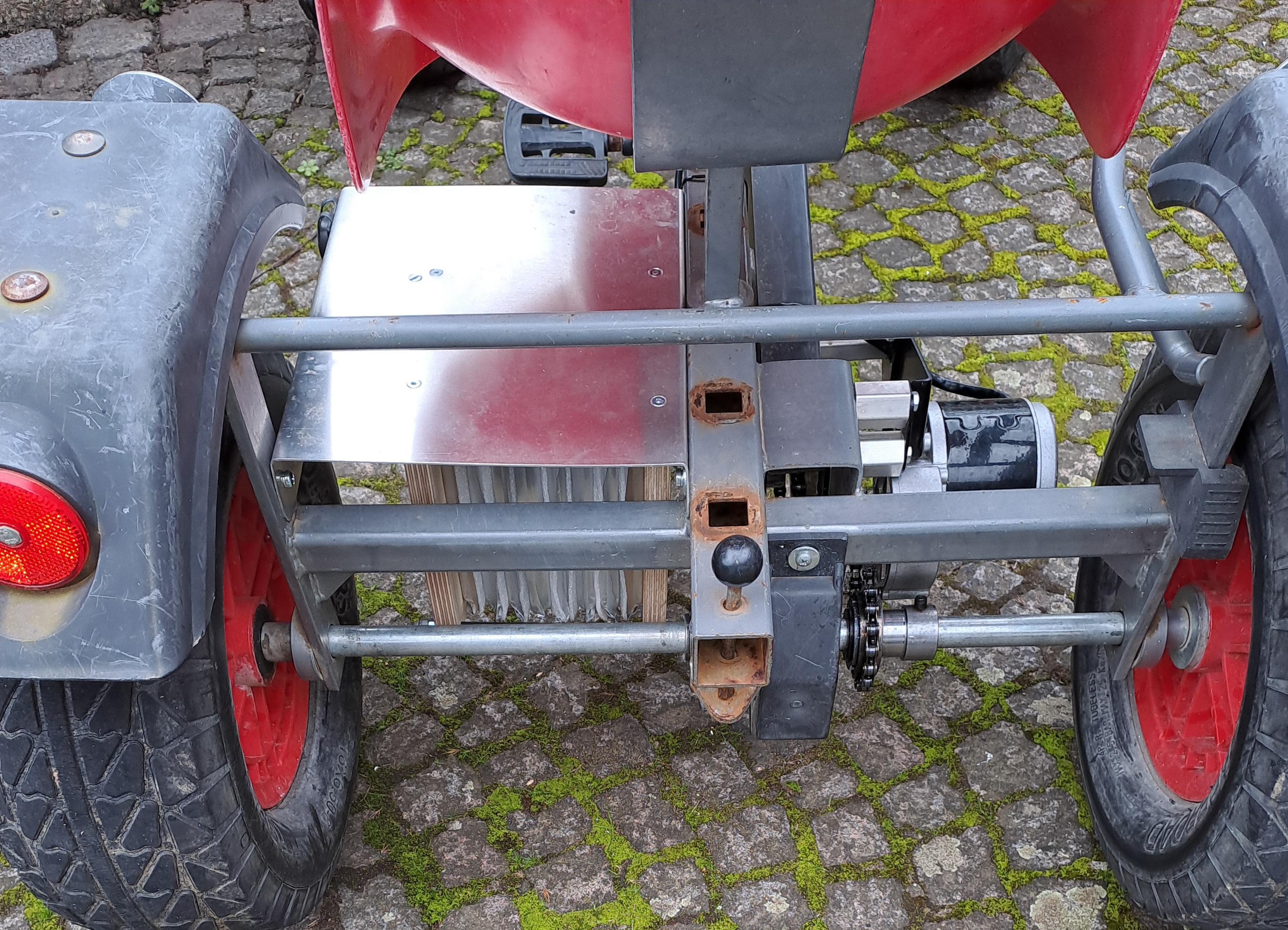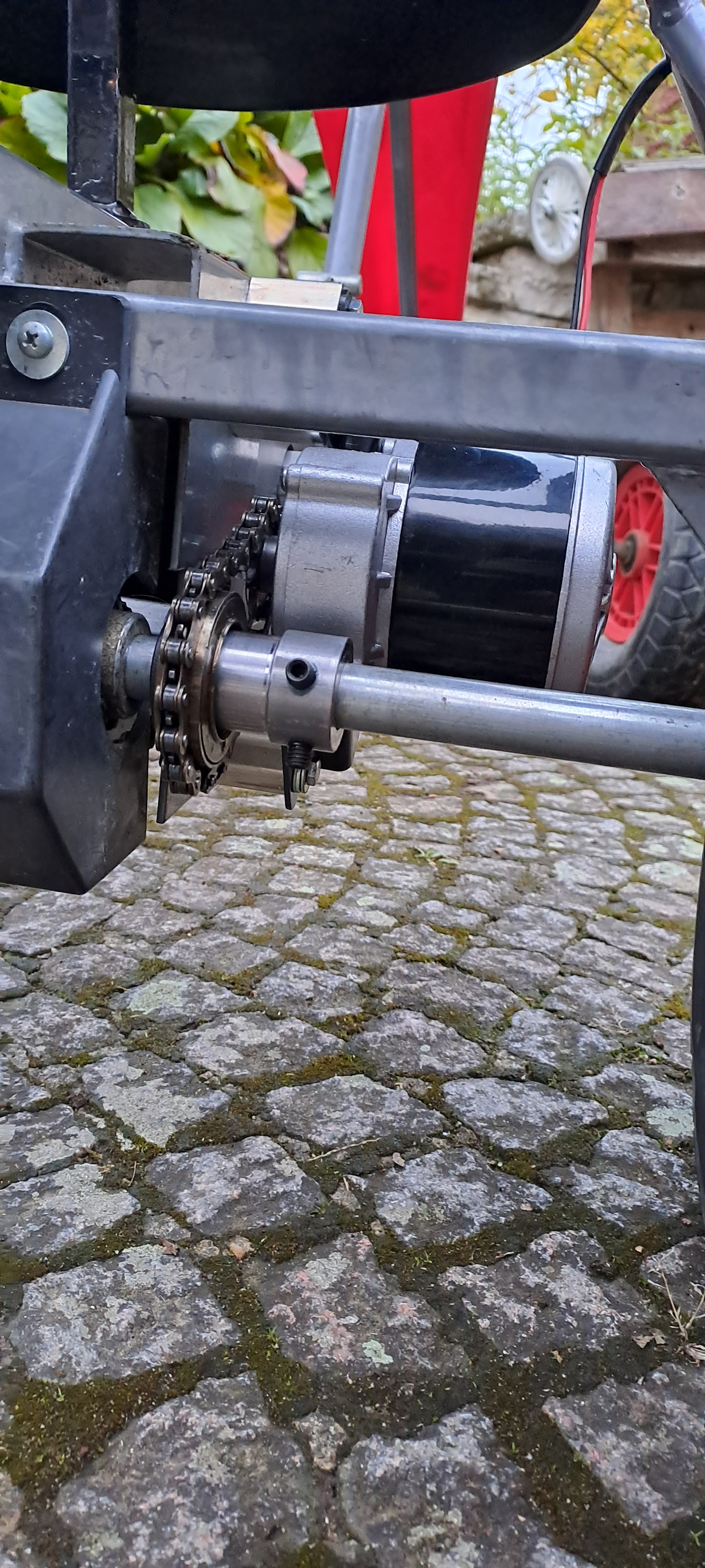Der Motor hängt über ein 18er Freilaufritzel von einem BMX auf der Welle über die das Rad auch mit Tretkurbel und Kette angetrieben werden kann.