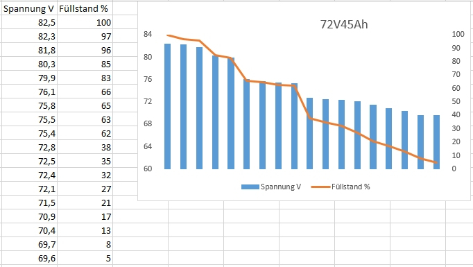Hoffe das ist soweit richtig. Also habe ich mir eine Tabelle gemacht von 72V bis 84V also 0 bis 100%