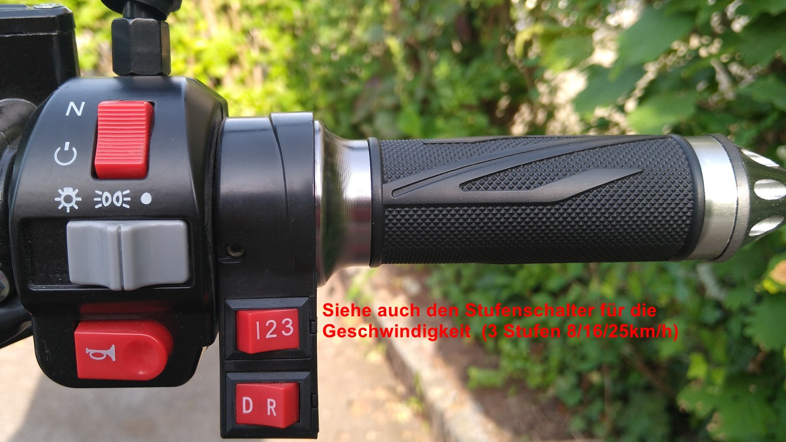 Es befindet auch am rechten "Gasgriff" ein Stufenschalter für die Geschwindigkeit  (3 Stufen 8/16/25km/h)