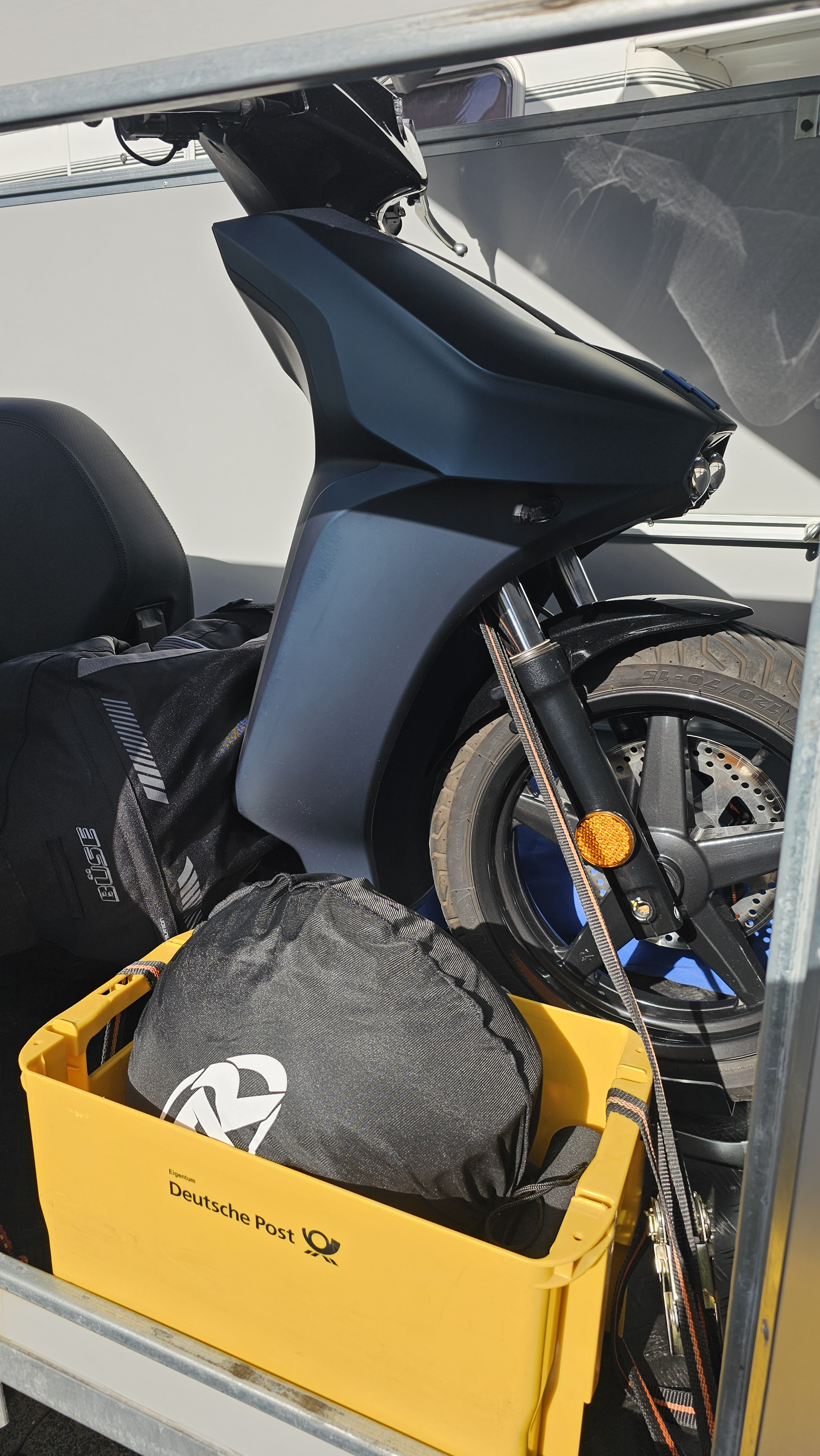 Vorweg kann ich schon mal sagen, dass das Einladen total entspannt war. Mit etwas Gas ging es ganz easy die Rampe hoch bis in den Vorderradständer. Dann noch 4 Spanngurte und fertig 👍